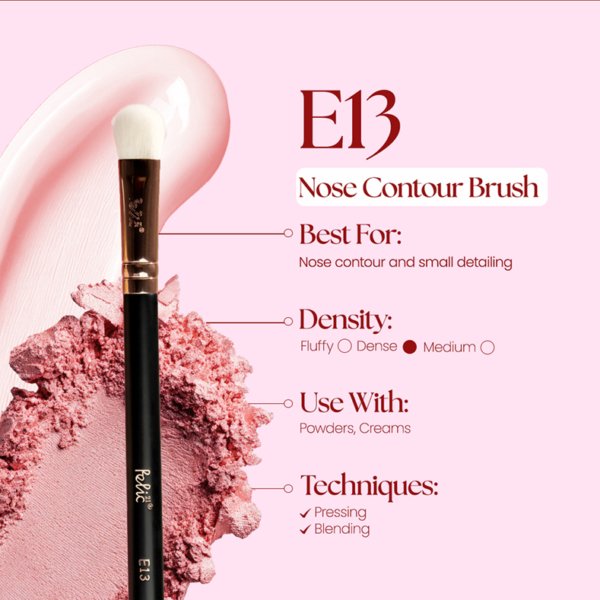 Designed specifically for nose contouring, the E13 Nose Contour Brush features a slim, angled shape that fits perfectly along the sides of the nose for sharp yet natural definition.