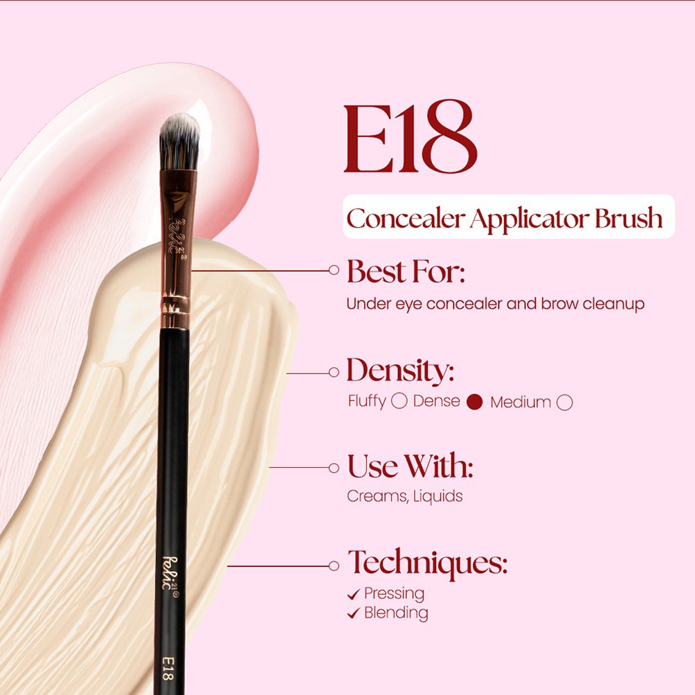 The E18 Concealer Applicator Brush is designed to blend concealer seamlessly into the skin, especially in hard-to-reach areas like under-eyes and around the nose.